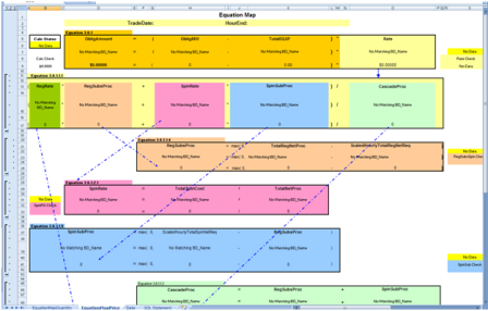 In energy settlements the settlements calculations can be (and are) very complex; however, the basic rule of thumb is Quantity * Price = Amount. In addition to this, we need to perform a verification and/or validation for each calculation. To follow this rule of thumb, I needed to be able to see all of the parts that made up the amount on one page (if possible), even if they don't directly tie to each other. As you can see in Figure 1, the rule for Charge Code Price is not connected to the Charge Code Quantity or Charge Code Quantity Verification; however it is nearby to show that it is important for viewing the whole picture.