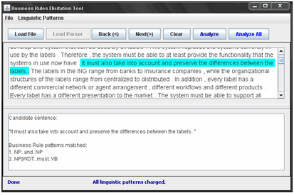 BRElicitationTool can process an entire documented specification as well as individual sentences. When an entire specification is analyzed, the tool generates a document with all the BR candidates' sentences. When a specific sentence is analyzed, the tool suggests the presence of a BR and shows the BR linguistic pattern detected, as shown in Figure 5 with the sentence: "It must also take into account and preserve the difference between the labels." The BRElicitationTool detects the presence of the patterns "NP … and … NP" and "NP|WDT … must … VB" in the sentence.