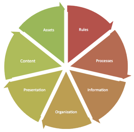 This principle of information-centric governance is the most important element that organizations should embrace as part of their rule governance approach.[3] One of the reasons that this approach is so important is that it allows a large set of rules to be broken into discrete and independent groups of rules. These groups of rules are independent because each of these groups has no visibility into the rules in any other group. Instead, each group of rules may refer to the information derived by another rule group or to other information that is known to the organization. This leads to the third principle of organizing rules: