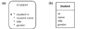 Figure 5(a) schematizes the same universe of discourse depicted in Table 1 as an Entity Relationship diagram in Barker notation (Barker ER).[3] The Barker ER schema depicts the primary reference scheme for Student and Course by prepending an octothorpe "#" to the student nr and course code attributes respectively. The asterisk "*" prepended to the student nr, student name, course code, and course title attributes indicates that these attributes are mandatory. The small "o" prepended to the grade attribute indicates that this attribute is optional. The half-solid, half-dashed lines indicate that the binary relationships are mandatory for Enrolment and optional for Student and Course. A crowsfoot at only the Enrolment end of the relationship lines indicates that the relationships are many-to-one. The stroke "|" through both the relationship lines indicates that these two relationships provide the primary reference scheme for Enrolment. Barker ER has no graphical way to display secondary keys, so the uniqueness of course titles is not captured in the diagram.