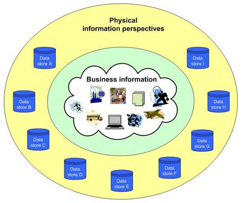 The physical instantiation of business information is the data held in data stores. These multiple perspectives are shown schematically in figure 4.